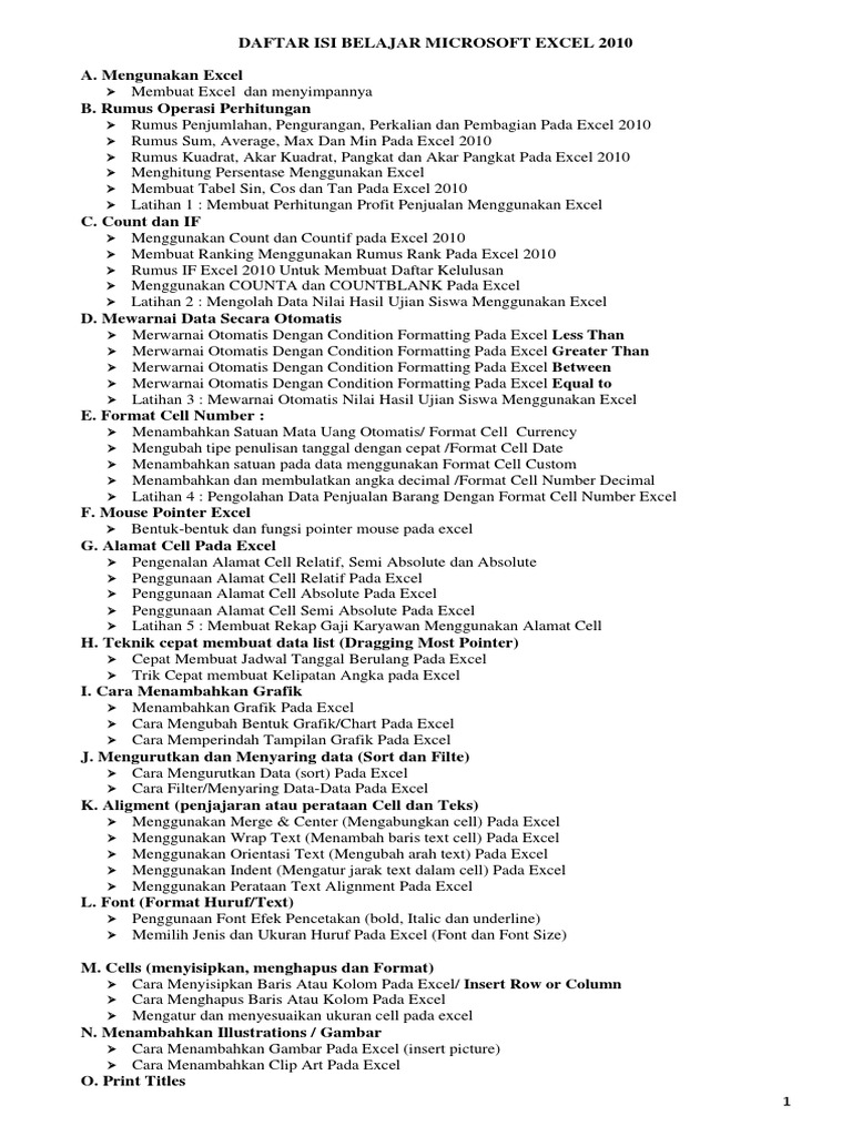 Daftar Isi Belajar Microsoft Excel 2010