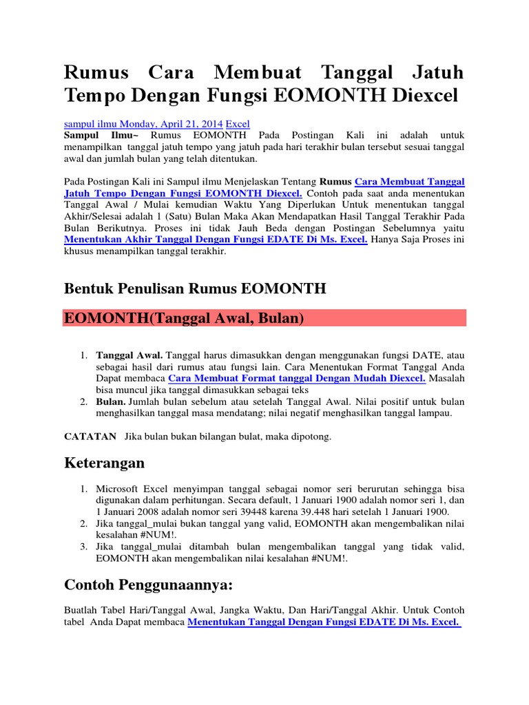 Berikut tutorial cara menggunakan fungsi edate. Gunakan eomonth untuk menghitung tanggal jatuh tempo yang jatuh pada hari terakhir bulan tersebut. Pada postingan ini saya akan coba sharing pengalaman saya dengan fungsi edate dalam excel dan dateadd dalam access.