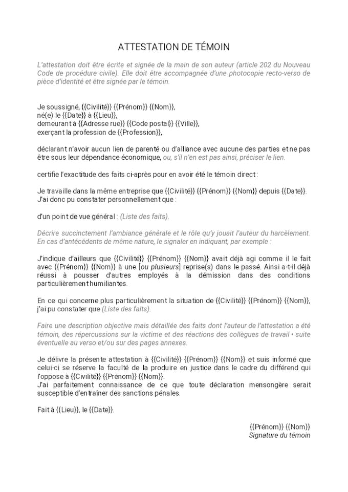 2019 Nous vous suggérons fortement de choisir quelquun qui vous aime à écrire votre lettre de référence de caractère. Il est également possible de sinspirer de lexemple de lettre de témoignage qui suit. Vous devez impérativement respecter certaines règles de forme dans la rédaction de votre attestation de témoin.