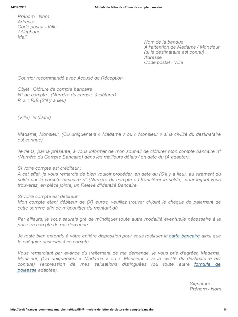 Lettre recommandée avec accusé de réception Objet. Lettre de clôture de compte bancaire rien ne vous interdit de clôturer un compte bancaire en france à condition de respecter une procédure par la présente je vous prie de bien vouloir procéder à la fermeture de mon compte bancaire indiquer le numéro de compte domicilié dans votre agence. Indiquez clairement votre volonté de fermer définitivement votre compte bancaire sans oublier de faire figurer vos coordonnées complètes et le numéro de compte.