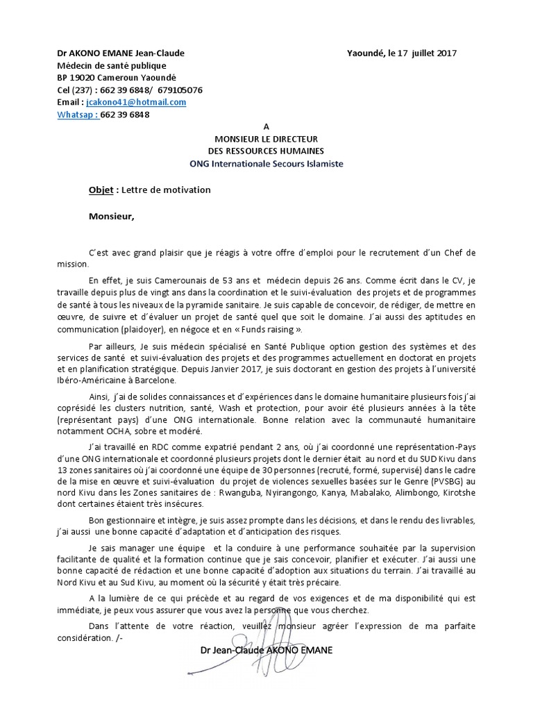 Ses responsabilités varient selon le projet et la taille des équipes. Publié 14 décembre 2020. Lettre de motivation mission humanitaire.