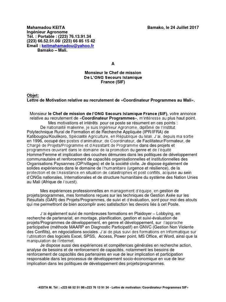 Lettre De Motivation M Keita Coordinateur Programmes Secours Islamiques France Sif Mali Organisation Non Gouvernementale