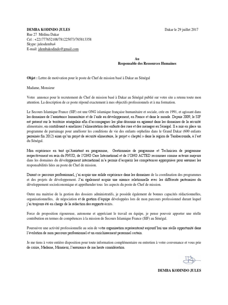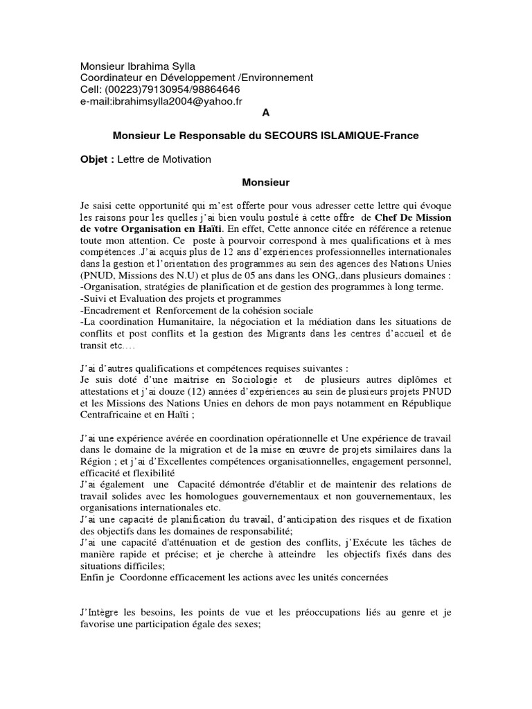 Lettre De Motivation Secours Islamique France Organisation Non Gouvernementale Programme Des Nations Unies Pour Le Developpement