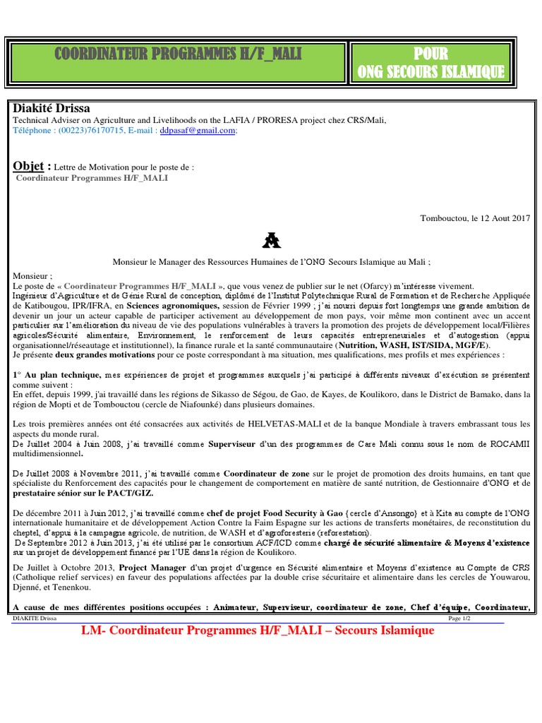 Lettre De Motivation Diakite Drissa Pour Votre Poste De Coordinateur De Programme Program Coordinator Au Mali Mali Securite Alimentaire