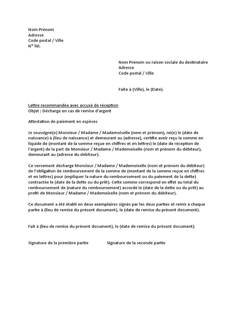 Lettre De Decharge En Cas De Remise D Argent